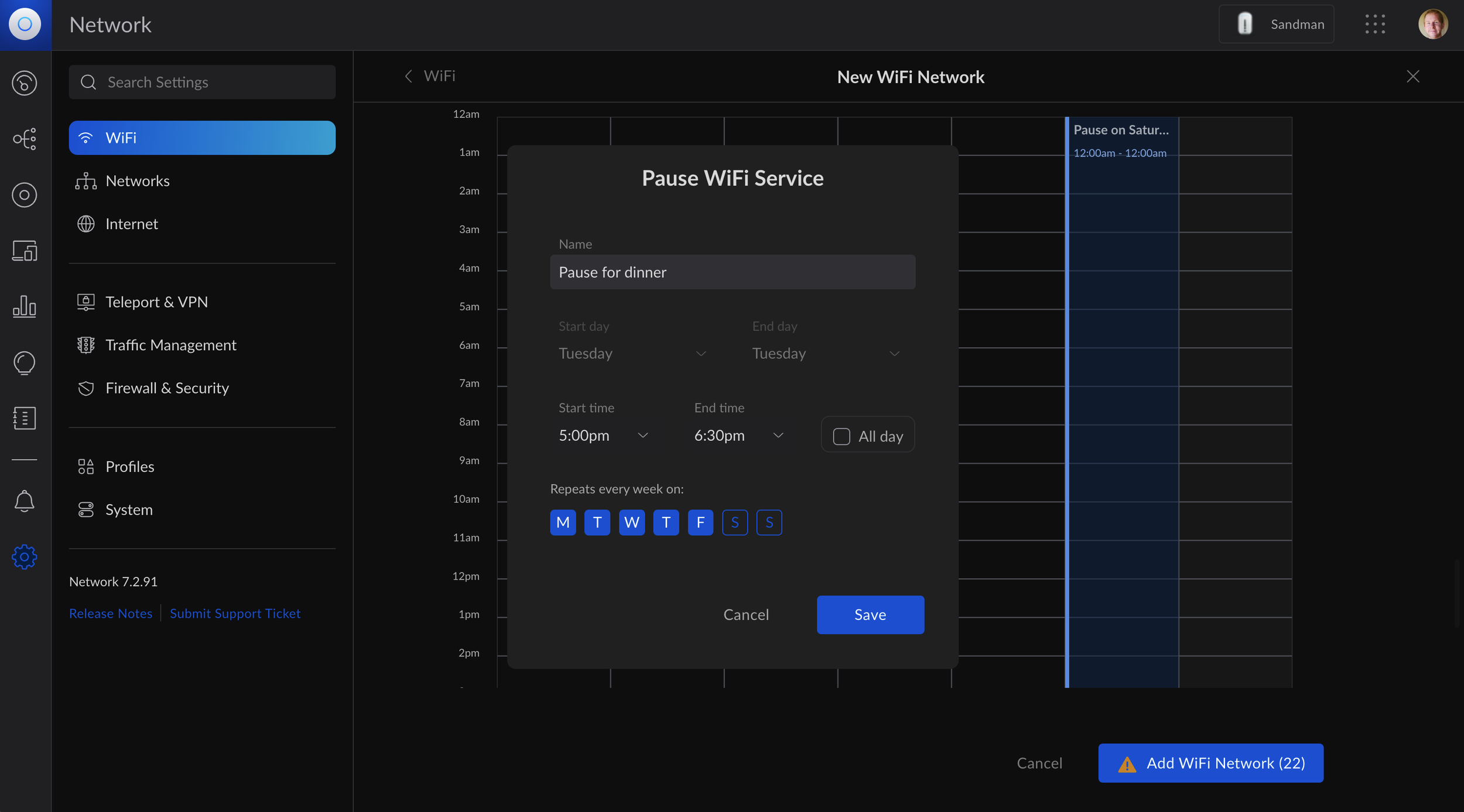 The UniFi Wi-Fi scheduler, as of version 7.2.91.